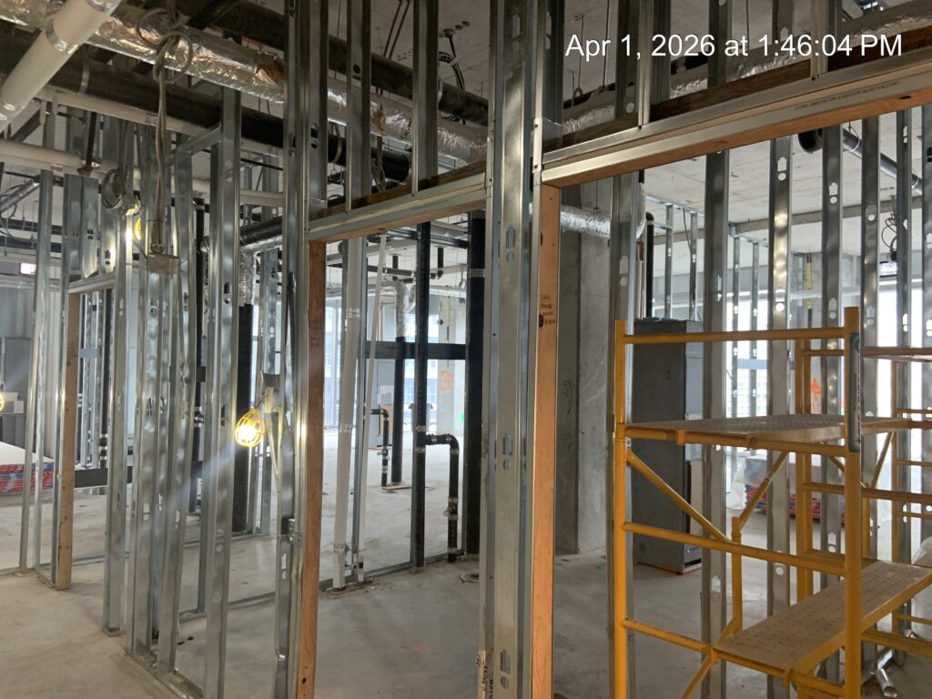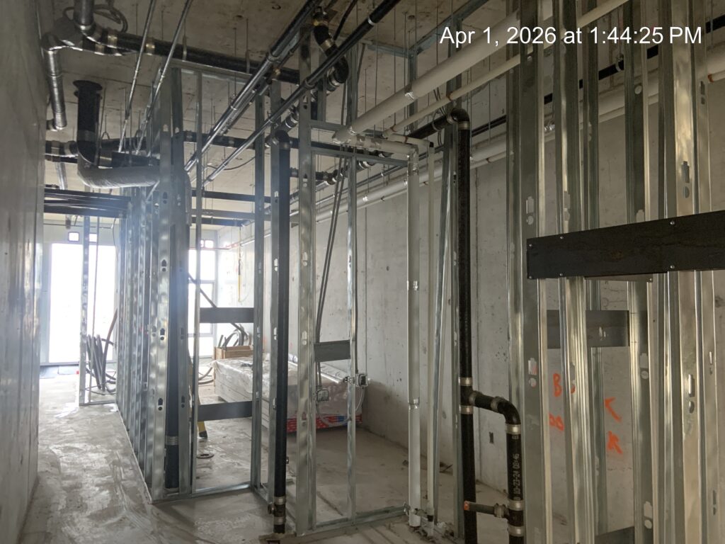 Corridor and demising wall framing are ongoing on level 9, 10, 12, and 13.